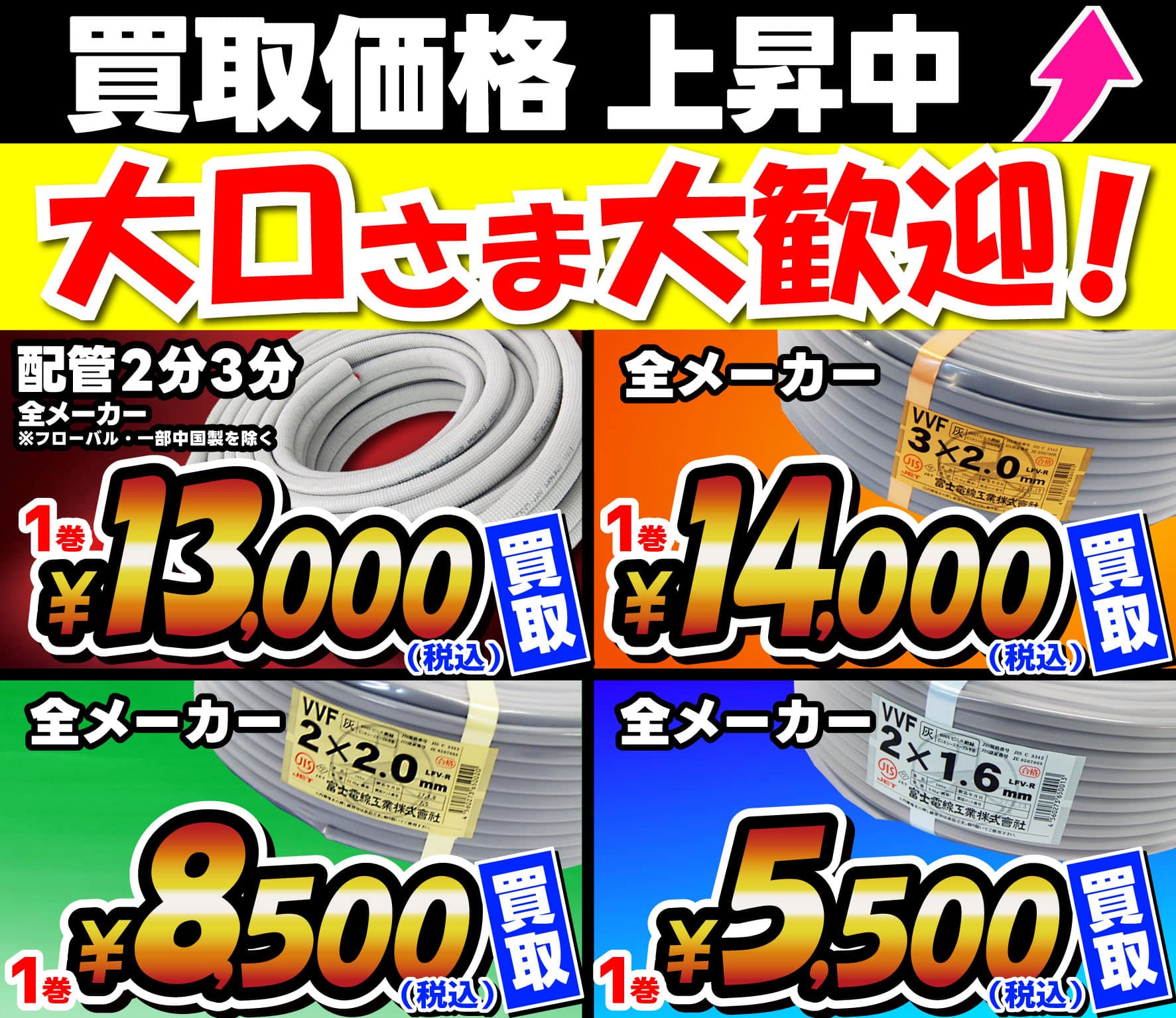 ◆電材買取センター◆余った電材・部材・工具を高価買取、その場で現金化!電線・電材・エアコン部材を激安販売!高価買取!